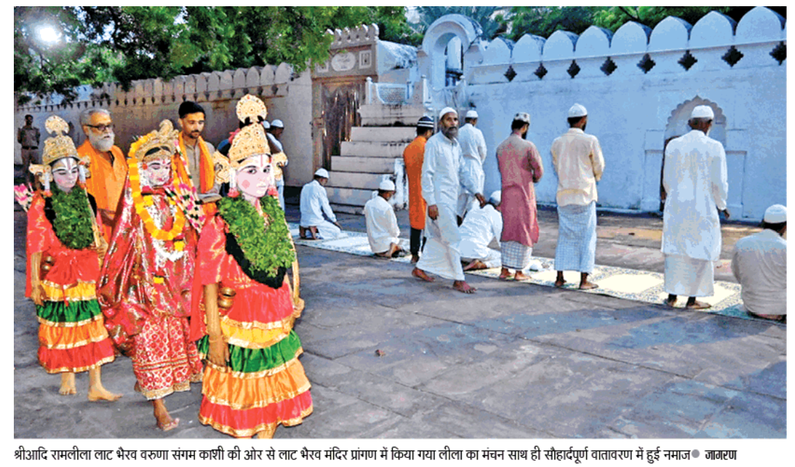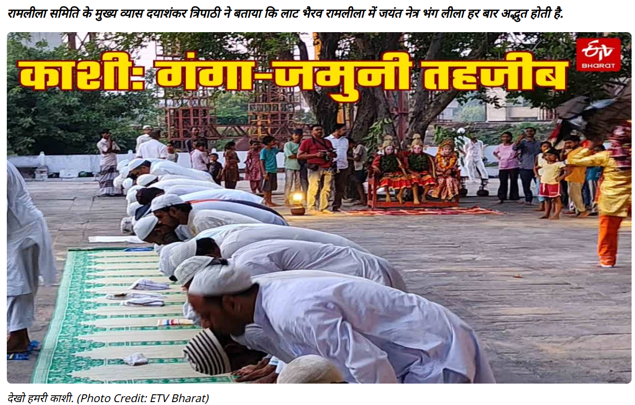 इसी तरह ईटीवी भारत की वेबसाइट पर भी हमें एक खबर मिली। 26 सितंबर की इस खबर में बताया गया, लाट भैरव मंदिर के चबूतरे पर जहां एक तरफ मुस्लिम समुदाय के लोग नमाज पढ़ते हैं। वहीं, दूसरी तरफ रामचरित मानस की चौपाइयां गूंजती हैं। यह तस्वीर तब और गहरी छाप छोड़ जाती है, जब हिंदू-मुस्लिम दोनों एकजुट होकर इस परंपरा को कायम रखते हैं।