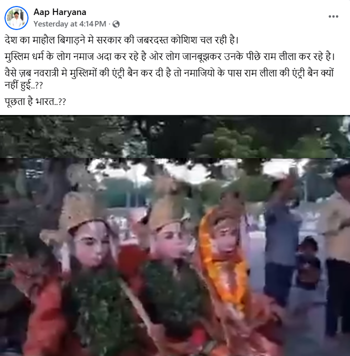 फेसबुक पेज आप हरियाणा ने एक वीडियो को पोस्ट करते हुए दावा किया, “देश का माहौल बिगाड़ने मे सरकार की जबरदस्त कोशिश चल रही है। मुस्लिम धर्म के लोग नमाज अदा कर रहे है ओर लोग जानबूझकर उनके पीछे राम लीला कर रहे है। वैसे ज़ब नवरात्री मे मुस्लिमों की एंट्री बैन कर दी है तो नमाजियो के पास राम लीला की एंट्री बैन क्यों नहीं हुई..?? पूछता है भारत..??”