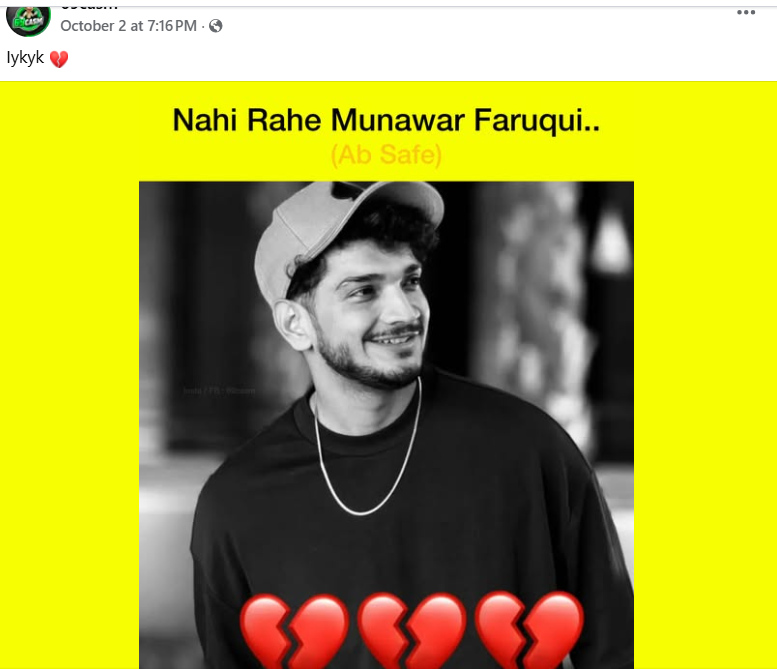 नई दिल्ली (विश्वास न्यूज)। दिल्ली के कालिंदी कुंज इलाके में पुलिस के साथ हुई मुठभेड़ में रोहित गोदारा और गोल्डी बरार गैंग के दो बदमाशों को गिरफ्तार किया है। यह दोनों बदमाश स्टैंड-अप कॉमेडियन मुनव्वर फारूकी की हत्या की साजिश रच रहे थे। इसी बीच सोशल मीडिया पर मुनव्वर फारूकी से जुड़ी एक पोस्ट वायरल हो रही है। पोस्ट में उनकी तस्वीर के साथ दावा किया जा रहा है कि मुनव्वर फारूकी का निधन हो गया है। पोस्ट को अलग-अलग मीडिया प्लेटफार्म पर शेयर किया जा रहा है।
