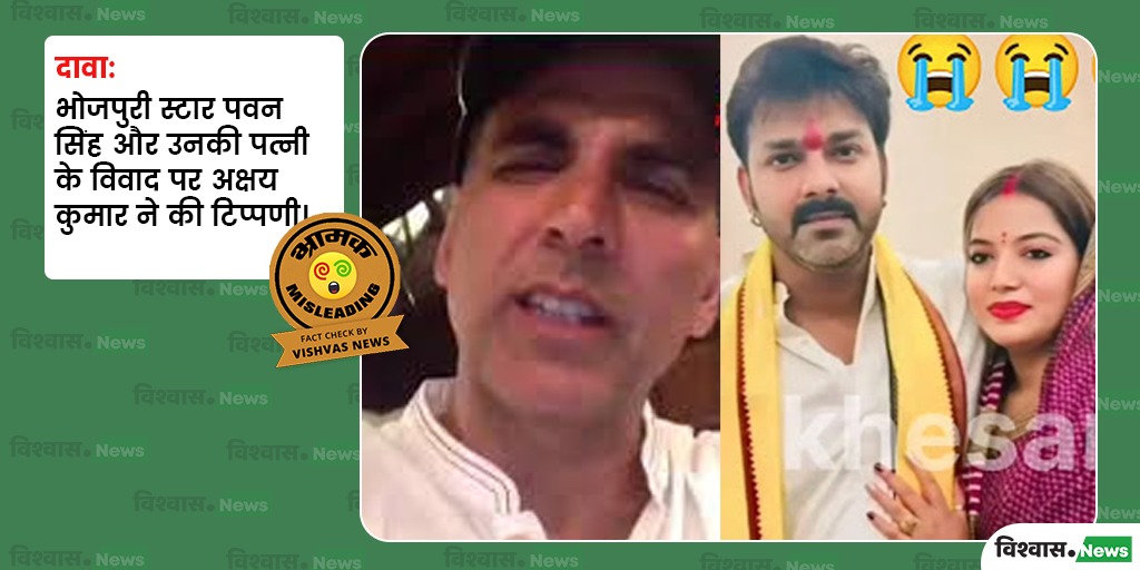 नई दिल्ली (विश्वास न्यूज)। भोजपुरी स्टार पवन सिंह और उनकी पत्नी ज्योति सिंह के दरमियान पिछले काफी समय से चल रहे विवाद के बीच सोशल मीडिया पर एक वीडियो वायरल हो रहा है, जिसमें बॉलीवुड एक्टर अक्षय कुमार को देखा जा सकता है। अक्षय कुमार वीडियो में किसी घटना के बारे में बात करते हुए नजर आ रहे हैं। वीडियो को शेयर करते हुए यूजर दावा कर रहे हैं कि यह वीडियो अक्षय कुमार ने पवन और ज्योति सिंह विवाद को लेकर शेयर किया है।