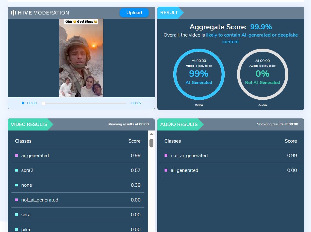AI डिटेक्शन टूल हाइव मॉडरेशन ने 99% से ज्यादा संभावना जताई कि वीडियो AI द्वारा जेनरेट किया गया है।