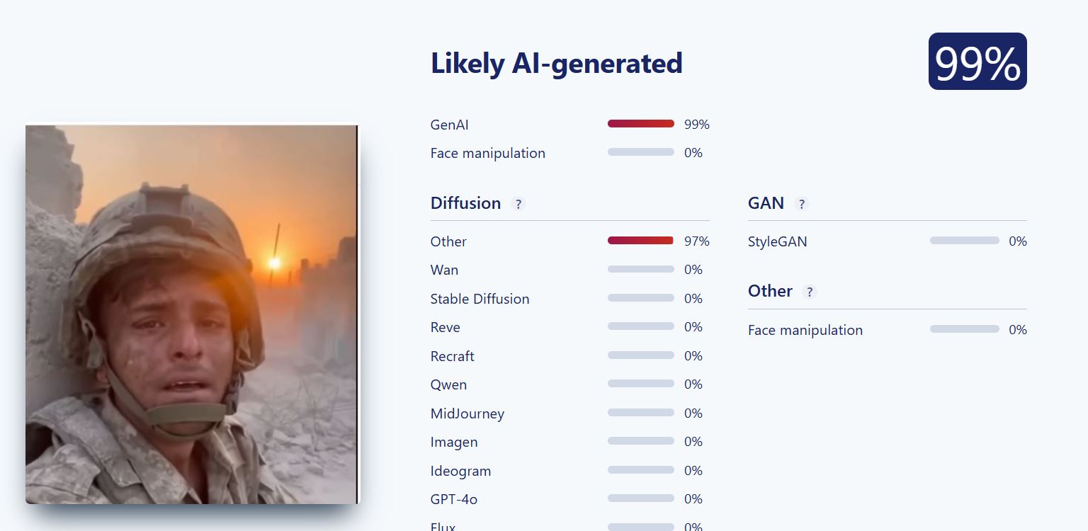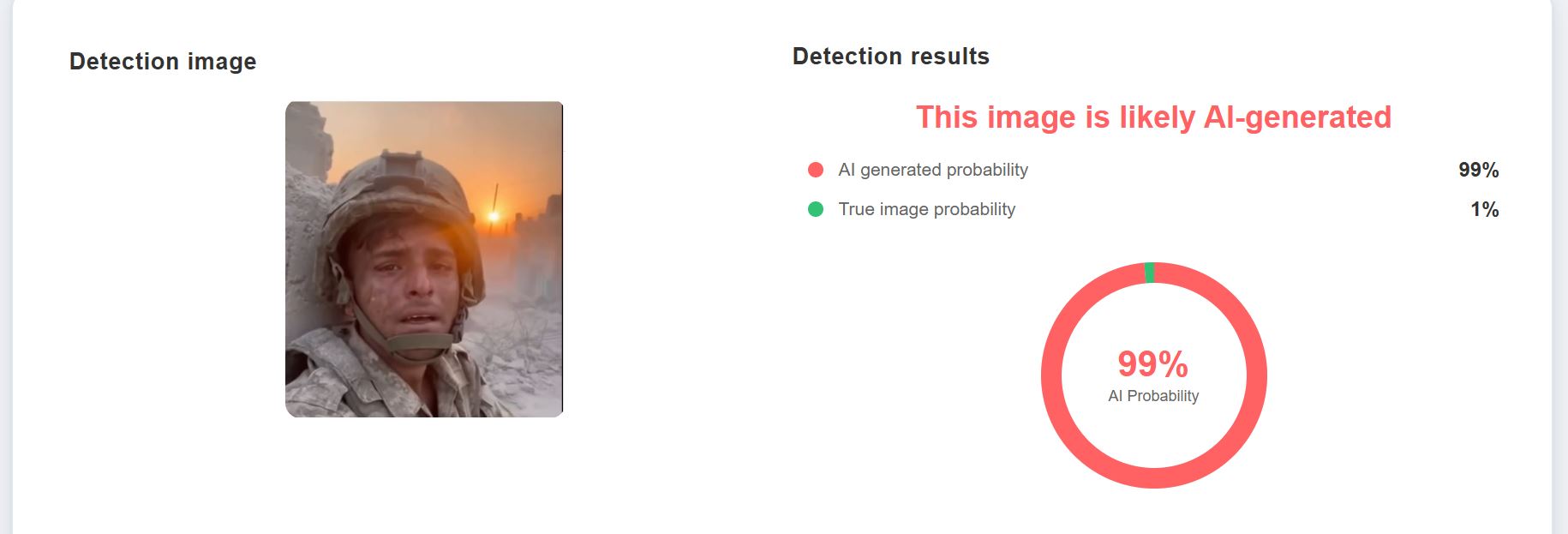 एक दूसरे टूल साइट इंजन ने वीडियो के स्क्रीनशॉट के AI निर्मित होने की संभावना 99 प्रतिशत से अधिक बताई।