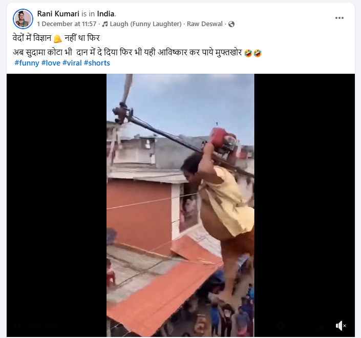 फेसबुक यूजर ‘Rani Kumari’ ने 1 दिसंबर 2025 को वायरल वीडियो को शेयर करते हुए कैप्शन में लिखा है, “वेदों में विज्ञान नहीं था फिर…अब सुदामा कोटा भी दान में दे दिया फिर भी यही आविष्कार कर पाये मुफ्तखोर।”
