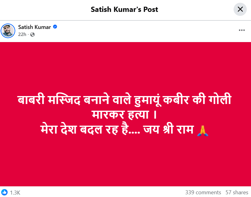 फेसबुक यूजर सतीश कुमार ने 7 दिसंबर को एक पोस्ट करते हुए दावा किया, “बाबरी मस्जिद बनाने वाले हुमायूं कबीर की गोली मारकर हत्या । मेरा देश बदल रह है….जय श्री राम।”