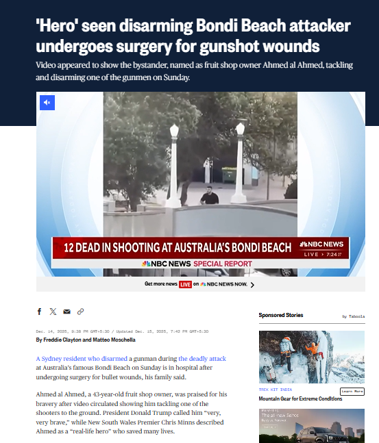 एनबीसी न्यूज की 14 दिसंबर 2025 की खबर में भी हमलावर को निहत्था करने वाले शख्स का नाम अहमद अल अहमद ही बताया गया। खबर के अनुसार, गोली लगने के कारण उनका ऑपरेशन हुआ और फिलहाल वे रिकवरी में हैं।