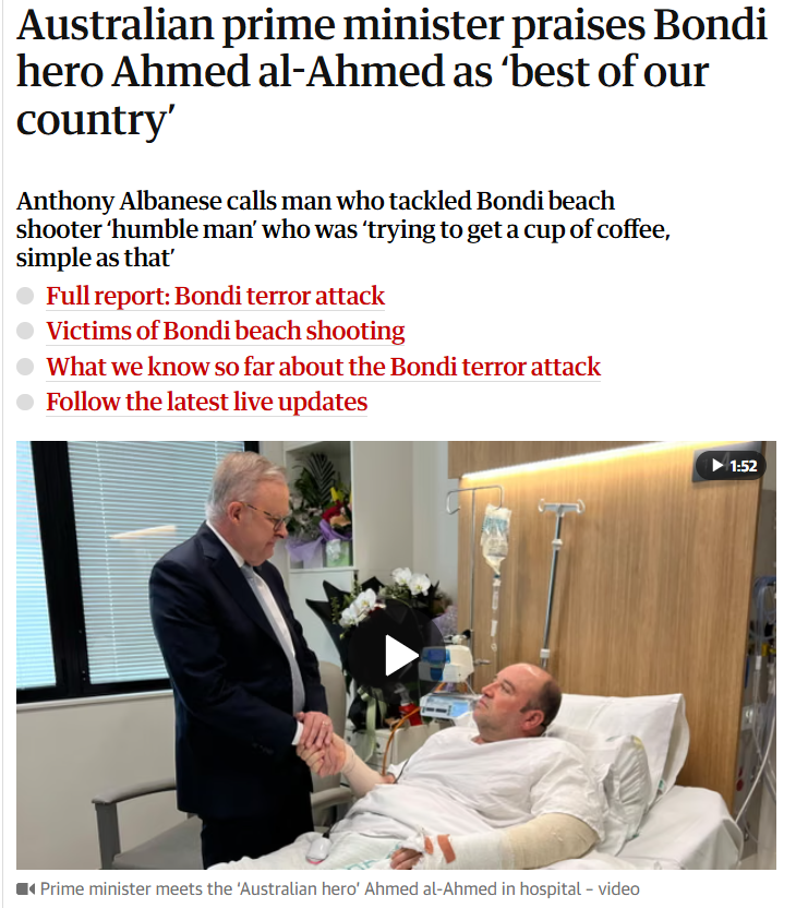 द गार्डियन की 16 दिसंबर 2025 की खबर में भी इस शख्स का नाम अहमद अल अहमद ही बताया गया। खबर के अनुसार, ऑस्ट्रेलियाई प्रधान मंत्री एंथनी अल्बानीज ने भी अहमद से अस्पताल में मुलाकात की और उनकी सराहना की। खबर में इस मुलाकात का वीडियो भी देखा जा सकता है।