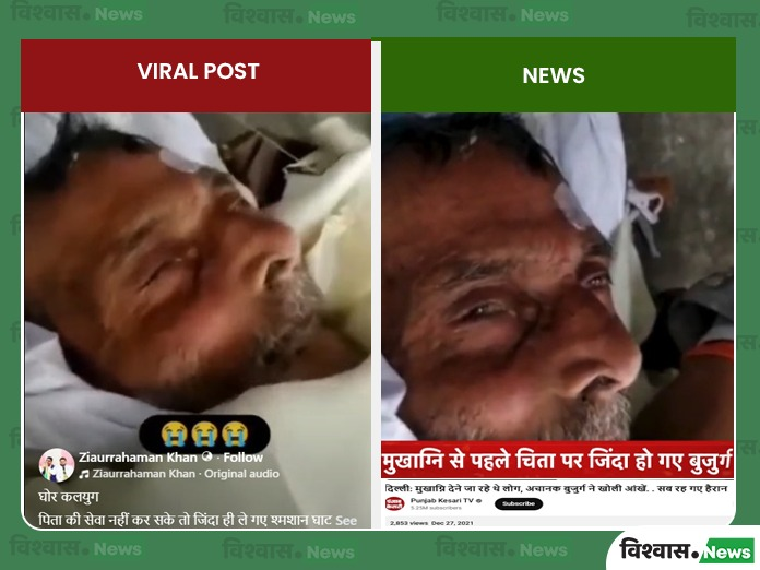 सर्च के दौरान पंजाब केसरी के यूट्यूब चैनल पर इस मामले से जुड़ी खबर मिली। 27 दिसंबर 2021 की खबर के अनुसार, “मौत की खबर से परिवार के लोग गमगीन थे, श्मशान घाट पर अंतिम संस्कार की तैयारियां चल रही थी और मृतक बुजुर्ग को मृत्यु शैय्या पर लिटाकर अग्नि दी ही जा रही थी कि अचानक बुजुर्ग ने आँखें खोल दी और उसके बाद उन्हें ले जाया गया।