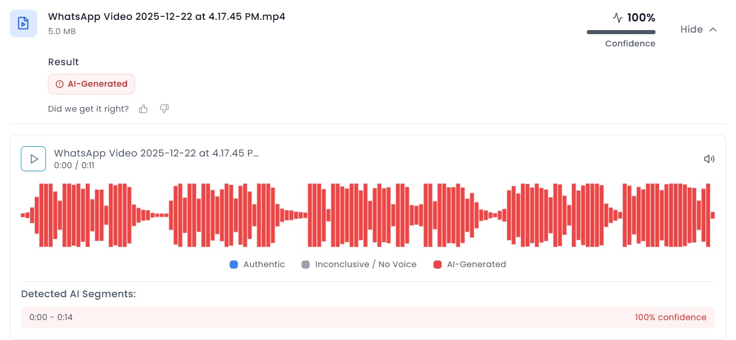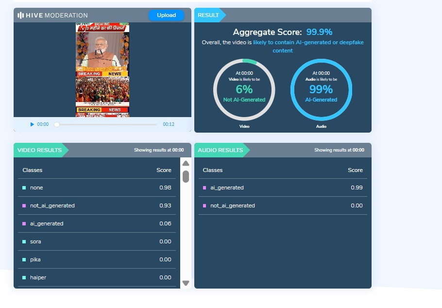 हमें वायरल वीडियो के डीपफेक होने का संदेह हुआ। हमने इसे चेक करने के लिए एआई डिटेक्शन टूल हाइव मोडरेशन का इस्तेमाल किया। टूल ने ऑडियो के 99 फीसदी तक डीपफेक होने की संभावना जताई।