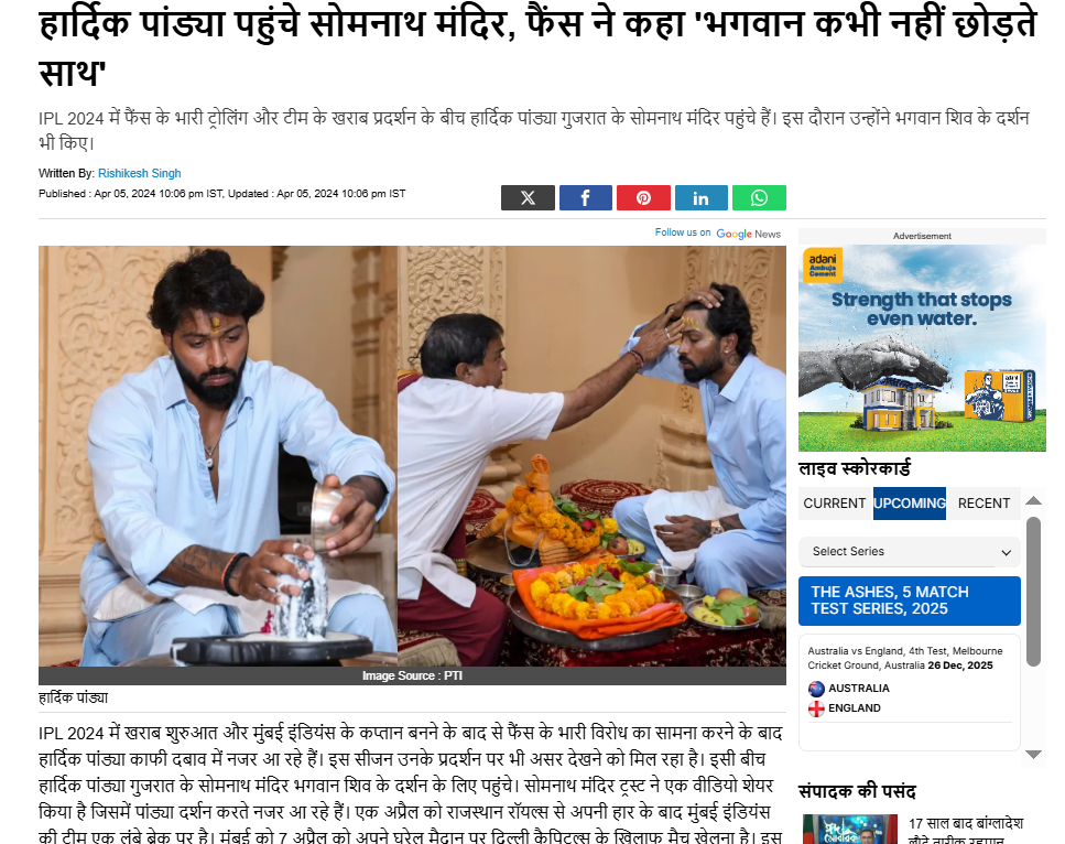 प्राप्त जानकारी के आधार पर हमने गूगल पर संबंधित कीवर्ड्स की मदद से सर्च किया। हमें दावे से जुड़ी एक रिपोर्ट ‘इंडिया टीवी’ की वेबसाइट पर 5 अप्रैल 2024 को प्रकाशित मिली। रिपोर्ट के अनुसार, “IPL 2024 में खराब शुरुआत और मुंबई इंडियंस के कप्तान बनने के बाद से फैंस के भारी विरोध का सामना करने के बाद हार्दिक पांड्या काफी दबाव में नजर आ रहे हैं। इस सीजन उनके प्रदर्शन पर भी असर देखने को मिल रहा है। इसी बीच हार्दिक पांड्या गुजरात के सोमनाथ मंदिर भगवान शिव के दर्शन के लिए पहुंचे। सोमनाथ मंदिर ट्रस्ट ने एक वीडियो शेयर किया है, जिसमें पांड्या दर्शन करते नजर आ रहे हैं।”