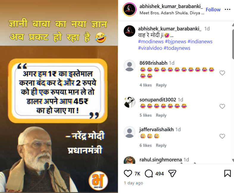इंस्टाग्राम यूजर abhishek_kumar_barabanki_ ने 23 दिसंबर को पोस्ट (आर्काइव लिंक) की है। इसमें पीएम मोदी की तस्वीर के साथ लिखा है, “अगर हम 1 रुपये का इस्तेमाल करना बंद कर दे और 2 रुपये को ही एक रुपया मान ले तो डालर अपने आप 45 रुपये का हो जाए गा!- नरेंद्र मोदी प्रधानमंत्री“