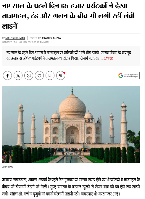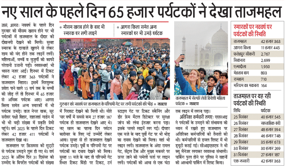 पड़ताल को आगे बढ़ाते हुए हमने दैनिक जागरण, आगरा के ईपेपर को स्कैन किया। वहां हमें 2 जनवरी 2025 की एक खबर से पता चला कि नए साल के पहले दिन करीब 65 हजार के आसपास पर्यटकों ने ताजमहल देखा था। खबर में विस्तार से बताया गया कि नववर्ष के पहले दिन टिकट लेकर 42 हजार 363 पर्यटकों ने ताजमहल निहारा। इसमें निश्शुल्क प्रवेश पाने वाले 15 वर्ष तक के बच्चों को जोड़ लें तो दिनभर में 65 हजार से अधिक पर्यटक आए।