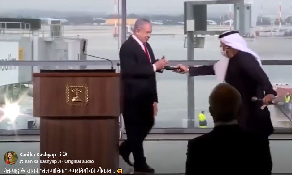 फेसबुक यूजर ‘कनिका कश्यप जी’ ने 6 जनवरी को वायरल वीडियो को शेयर करते हुए लिखा, “नेतन्याहू के सामने “तेल मालिक” अमरतियों की औकात। ताऊ नेतन्याहू एक अरबी मुचलमान के हाथ से माइक तबतक नही लेते जबतक अपने हाथों को कीटाणुनाशक चिपचिपे पदार्थ से सुरक्षित नही कर लेते।”
