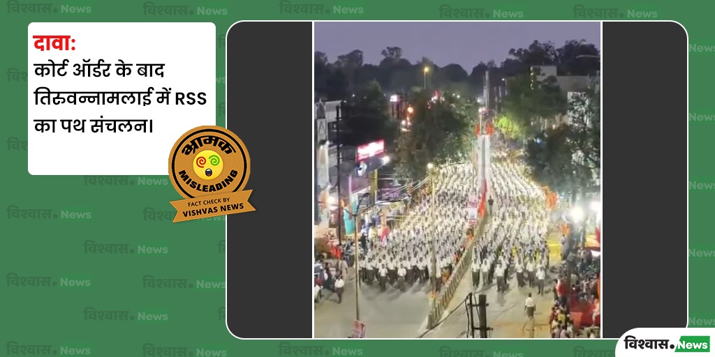 नई दिल्ली (विश्वास न्यूज)। सोशल मीडिया पर राष्ट्रीय स्वयंसेवक संघ (RSS) का एक वीडियो वायरल हो रहा है। वायरल वीडियो में बहुत से कार्यकर्ता पथ संचलन करते हुए देखे जा सकते हैं। वीडियो को शेयर करते हुए यूजर दावा कर रहे हैं कि तमिलनाडु के तिरुवन्नामलाई में कोर्ट के आदेश के बाद भारी पुलिस सुरक्षा के बीच आरएसएस ने पथ संचलन किया हैऔर यह उसी का वीडियो है।