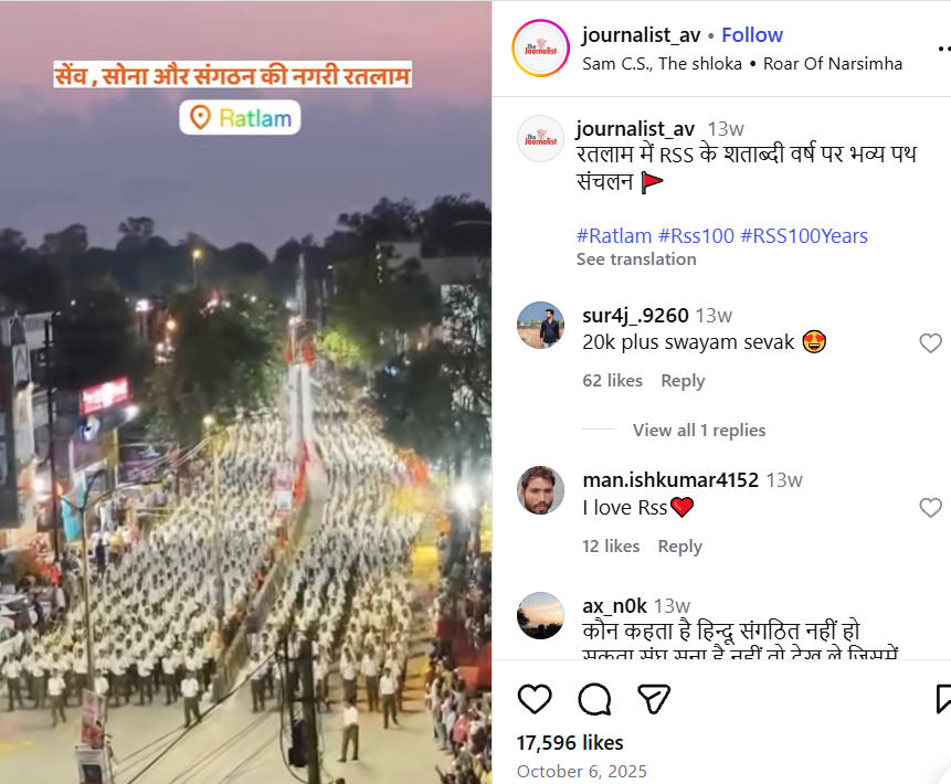 अपनी पड़ताल को शुरू करते हुए सबसे पहले हमने वायरल वीडियो के ऑरिजिनल सोर्स को ढूंढ़ना शुरू किया। हमें यह वीडियो journalist_av नाम के इंस्टाग्राम अकाउंट पर 6 अक्टूबर 2025 को शेयर किया हुआ मिला। यहां वीडियो के साथ टाइटल दिया गया था, “रतलाम में RSS के शताब्दी वर्ष पर भव्य पथ संचलन।”