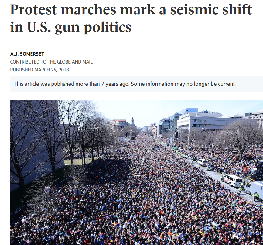 इसी बुनियाद पर न्यूज सर्च किए जाने पर हमें द ग्लोब एंड मेल की न्यूज वेबसाइट पर 25 मार्च 2018 का एक ओपिनियन आर्टिकल मिला। यह लेख अमेरिका में बड़े पैमाने पर हुए विरोध मार्चों, खासकर ‘मार्च फॉर आवर लाइव्स’ जैसे प्रदर्शनों पर लिखा गया है। बताया गया कि इन आंदोलनों ने अमेरिकी गन पॉलिटिक्स (बंदूक नीति) में एक बड़ा और निर्णायक बदलाव दिखाया है। युवाओं के नेतृत्व में हुए इन प्रदर्शनों ने बंदूक हिंसा को केवल सामाजिक चिंता से आगे बढ़ाकर एक मजबूत राजनीतिक और चुनावी मुद्दा बना दिया है। इससे नीति-निर्माताओं, राजनीतिक दलों और सार्वजनिक बहस पर दबाव बढ़ा है, जो संकेत देता है कि अमेरिका में बंदूक नियंत्रण को लेकर सोच और राजनीति अब पहले जैसी नहीं रही।