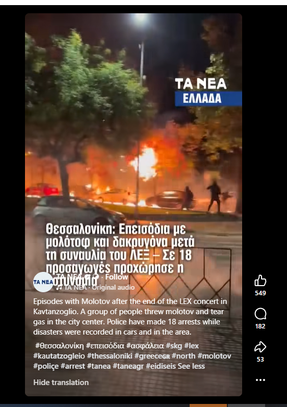 अपनी पड़ताल को शुरू करते हुए सबसे पहले हमने वायरल वीडियो के की-फ्रेम्स निकाले और उन्हें गूगल लेंस के जरिए सर्च किया। सर्च में हमें यह वीडियो ग्रीस के अखबार टीए एनइए नाम के फेसबुक पेज पर अपलोड किया हुआ मिला। 2 नवंबर 2025 को अपलोड हुए वीडियो के साथ दी गई जानकारी एक अनुसार, ग्रीस के थेसालोनिकी शहर में रैपर LEX की कॉन्सर्ट खत्म होने के बाद हालात बिगड़ गए। कॉन्सर्ट के बाद कुछ लोगों ने शहर के बीचों-बीच मोलोटोव कॉकटेल और आंसू गैस फेंकी, जिससे हिंसा फैल गई।
