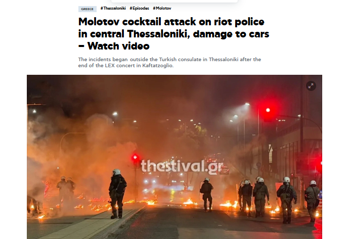 इसी बुनियाद पर हमने अपनी पड़ताल को आगे बढाया और हमें हफिंग्टन पोस्ट ग्रीस की वेबसाइट पर इसी मामले से जुड़ी खबर मिली। 2 नवंबर 2025 की खबर में बताया गया कि शनिवार रात ग्रीस के थेसालोनिकी शहर में मशहूर रैपर LEX की कॉन्सर्ट के बाद गंभीर हिंसक घटनाएं सामने आईं। करीब 100 लोग तुर्कीय दूतावास की ओर बढ़े और वहां मौजूद पुलिस पर हमला कर दिया। हमलावरों ने 60 से ज्यादा मोलोटोव कॉकटेल फेंके, जिससे सड़क पर खड़ी छह कारों को बुरी तरह नुकसान पहुंचा।
