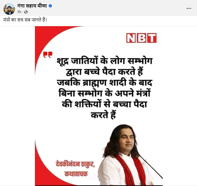 फेसबुक यूजर गंगा सहाय मीणा ने 17 जनवरी 2026 को एक पोस्ट कार्ड को शेयर किया। इसमें दावा किया गया कि देवकीनंदन ने कहा, “शूद्र जातियों के लोग संभोग द्वारा बच्चे पैदा करते हैं। जबकि ब्राह्मण शादी के बाद बिना संभोग के अपने मंत्रों की शक्तियों से बच्चा पैदा करते हैं।”