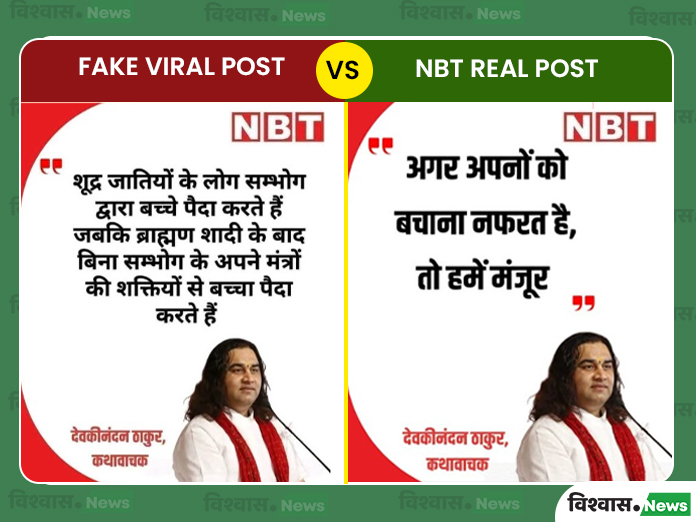 नई दिल्ली (विश्वास न्यूज)। कथावाचक देवकीनंदन ठाकुर के बयान के नाम पर सोशल मीडिया पर एक पोस्टकार्ड वायरल हो रहा है। इसमें ऊपर नवभारत टाइम्स का लोगो भी लगा हुआ है। इसमें देवकीनंदन ठाकुर की तस्वीर का इस्तेमाल करते हुए लिखा गया कि शूद्र जातियों के लोग संभोग द्वारा बच्चे पैदा करते हैं। जबकि ब्राह्मण शादी के बाद बिना संभोग के अपने मंत्रों की शक्तियों से बच्चा पैदा करते हैं। इस बयान को देवकीनंदन ठाकुर का बयान समझकर कई सोशल मीडिया यूजर्स शेयर कर रहे हैं।