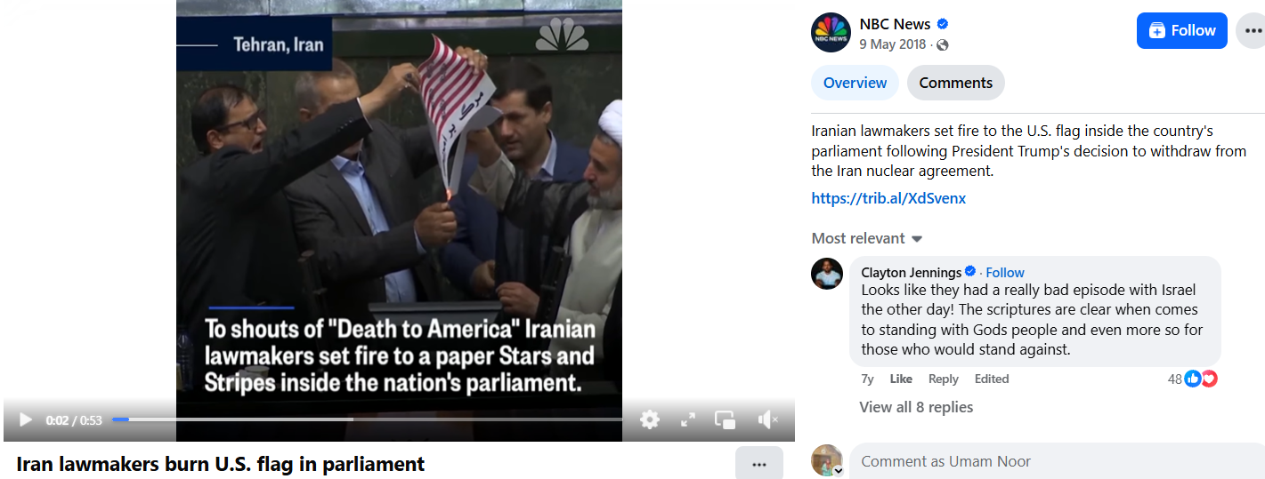 यह दावा इससे पहले भी सोशल मीडिया पर वायरल हो चुका है। वायरल दावे की पड़ताल को शुरू करते हुए हमने सबसे पहले वायरल वीडियो के की-फ्रेम्स निकाले और उन्हें गूगल लेंस के जरिए सर्च किया। सर्च किए जाने पर हमें यह वीडियो 9 मई 2018 को एनबीसी के फेसबुक पेज पर अपलोड किया हुआ मिला। यहां बताया गया, परमाणु समझौतों को लेकर ईरान की संसद में अमेरिकी झंडों को जलाया गया।