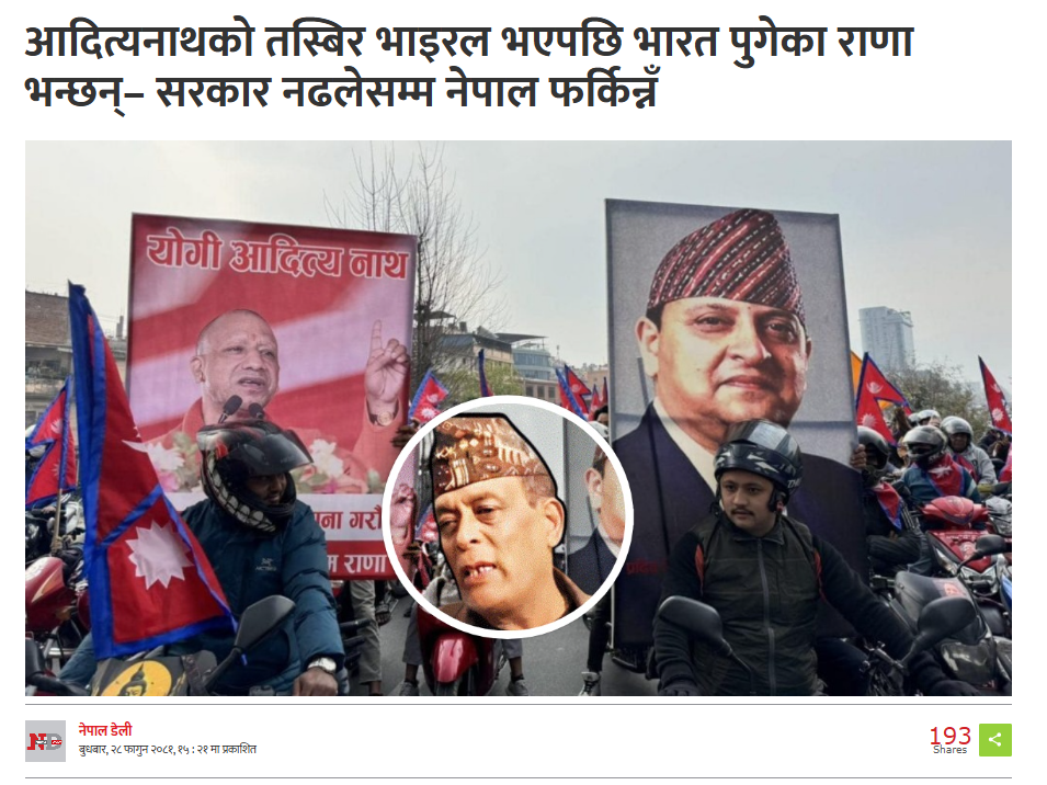 13 मार्च को बीबीसी नेपाल की वेबसाइट पर छपी खबर के अनुसार, “नेपाल में पूर्व राजा के स्वागत में योगी आदित्यनाथ की तस्वीर दिखाए जाने पर विवाद हो गया। भारत के पूर्व राजदूत रणजीत रे का मानना है कि यह आर्थिक मंदी और निराशा से उपजा आक्रोश है, जिसका राजशाही समर्थक फायदा उठा रहे हैं।”