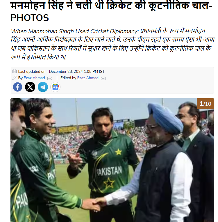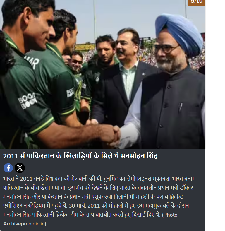 वायरल दावे की सच्चाई जानने के लिए हमने तस्वीर को गूगल लेंस की मदद से रिवर्स इमेज सर्च किया। हमें यह तस्वीर इंडिया डॉट कॉम की 28 दिसंबर 2024 की एक गैलरी में मिली। यहाँ कैप्शन में लिखा था, “2011 आईसीसी विश्व कप के दौरान डॉक्टर मनमोहन सिंह मोहाली के पंजाब क्रिकेट एसोसिएशन स्टेडियम में भारत-पाक विश्व कप सेमीफाइनल के दौरान पाकिस्तानी क्रिकेट टीम के साथ।”