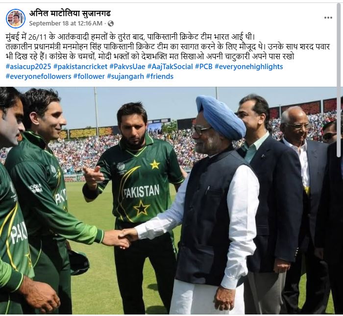 फेसबुक यूजर ‘अनिल माटोलिया सुजानगढ’ ने 18 सितंबर 2025 को वायरल तस्वीर को शेयर करते हुए कैप्शन में लिखा, “मुंबई में 26/11 के आतंकवादी हमलों के तुरंत बाद, पाकिस्तानी क्रिकेट टीम भारत आई थी। तत्कालीन प्रधानमंत्री मनमोहन सिंह पाकिस्तानी क्रिकेट टीम का स्वागत करने के लिए मौजूद थे। उनके साथ शरद पवार भी दिख रहे हैं। कांग्रेस के चमचों, मोदी भक्तों को देशभक्ति मत सिखाओ अपनी चाटुकारी अपने पास रखो।”