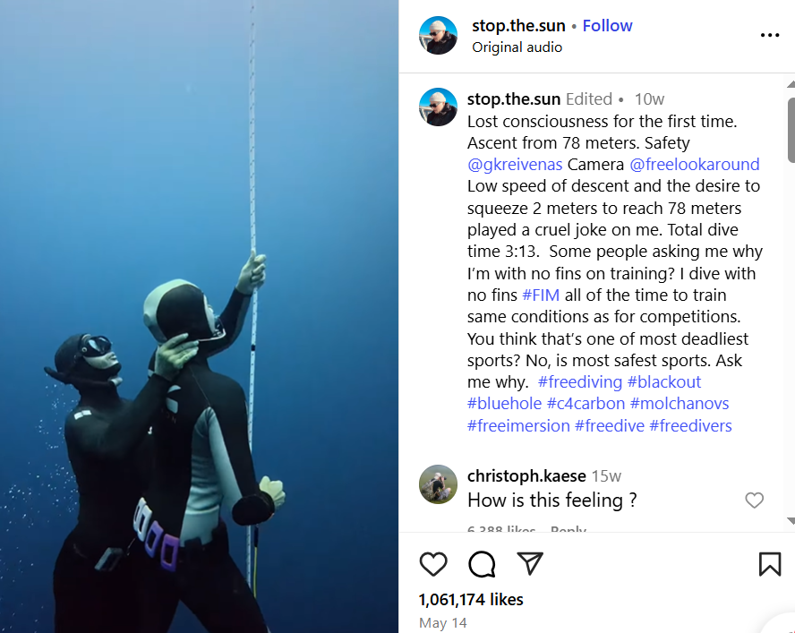 टाइम टूल की मदद से हमने अलग-अलग कीवर्ड डालकर इस वीडियो को सर्च करना शुरू कर दिया। हमें यह वीडियो Stop the Sun नाम के एक इंस्टाग्राम अकाउंट पर मिला, जहां इसे 14 मई 2025 को अपलोड किया गया था। वहां दी गई जानकारी के अनुसार, वीडियो में दिख रहा शख्स 78 मीटर गहराई तक डाइव करने गया था। इस दौरान उसकी रफ्तार धीमी रही और ऊपर आते वक्त वह थोड़ी देर के लिए बेहोश भी हो गया। पोस्ट में यह भी लिखा है कि यह उसकी ट्रेनिंग डाइव थी और उसने जानबूझकर बिना फिन्स (पैरों में पहनने वाला डाइविंग गियर) के अभ्यास किया था। वहीं, यह डाइव खतरनाक नहीं, बल्कि सुरक्षित है।